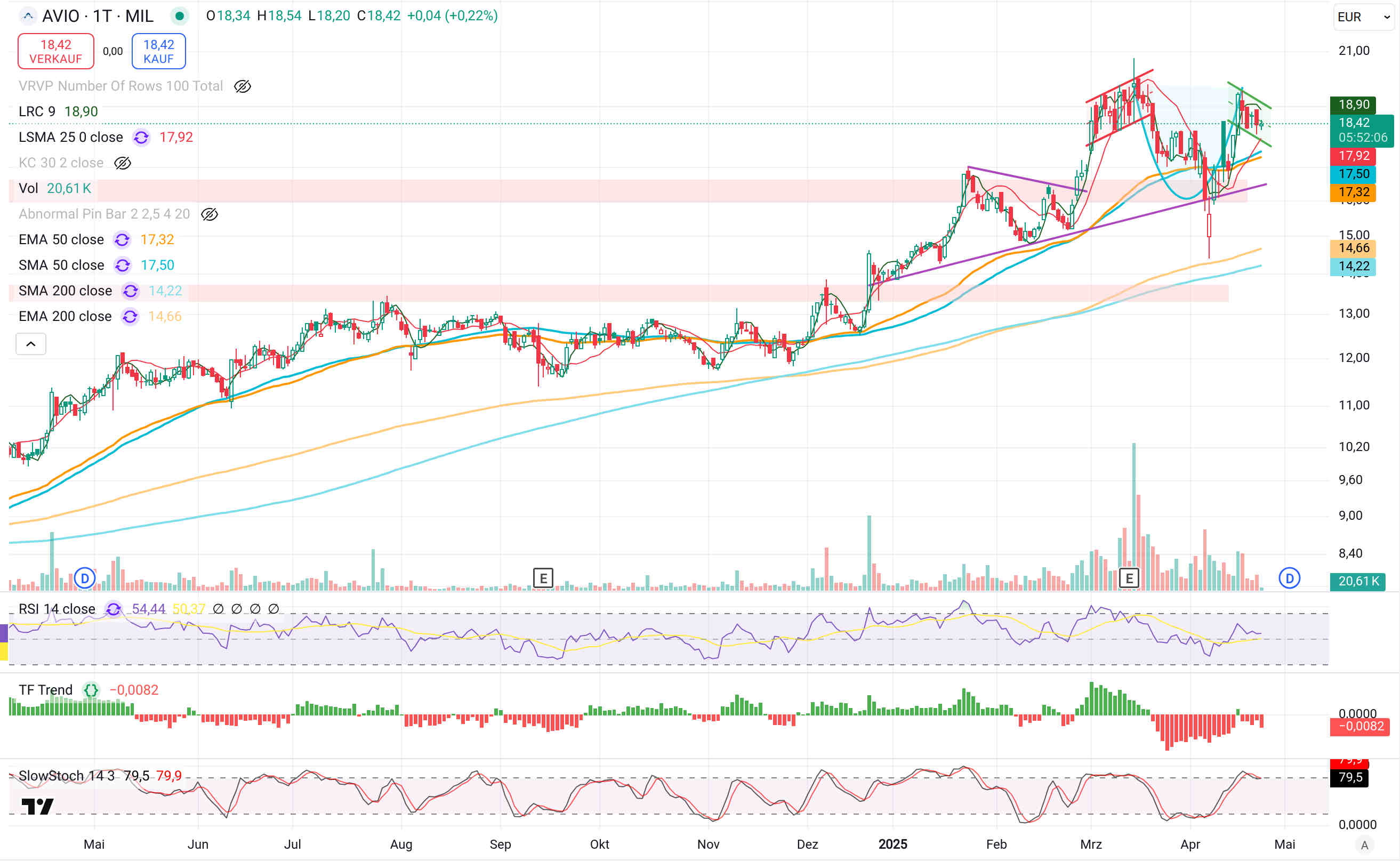 Avio ist an einer unteren Trendbegrenzung eines Aufwärtstrends + 50er Linien angelangt + Slow Stochastik im stark überverkauften Bereich positiv gekreuzt.