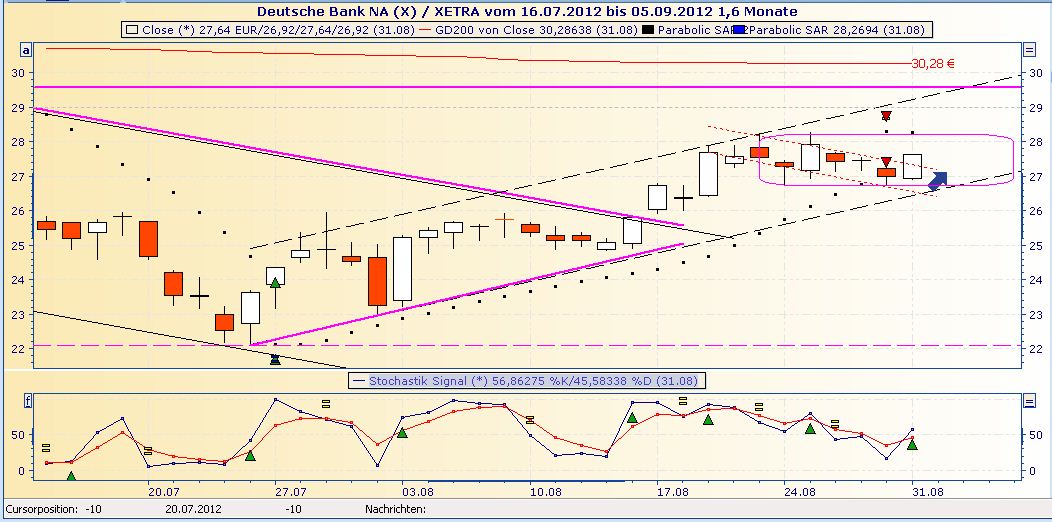 Die Aktie der Deutschen Bank notiert aktuell bei 27,28 Euro (+1,13 Prozent). (31.08.2012/ac/n/d)