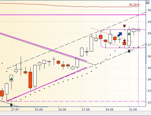 Fazit: Einstiegskurse bei 27 € und schwachem Markt und 30,50 € bei Hausse. Zur Zeit würde ich noch halten, da der Dow-Jones noch recht positiv gestimmt ist! (siehe Chart-Indikatoren).
