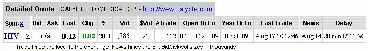 CALYPTE BIOMEDICAL (AMEX:HIV) Delayed quote data