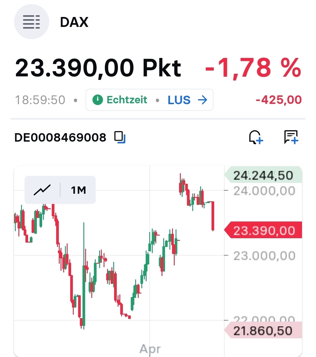 Tagesspanne Freitag Xetra 24057/23767 rund 300 Punkte über Sschnitt