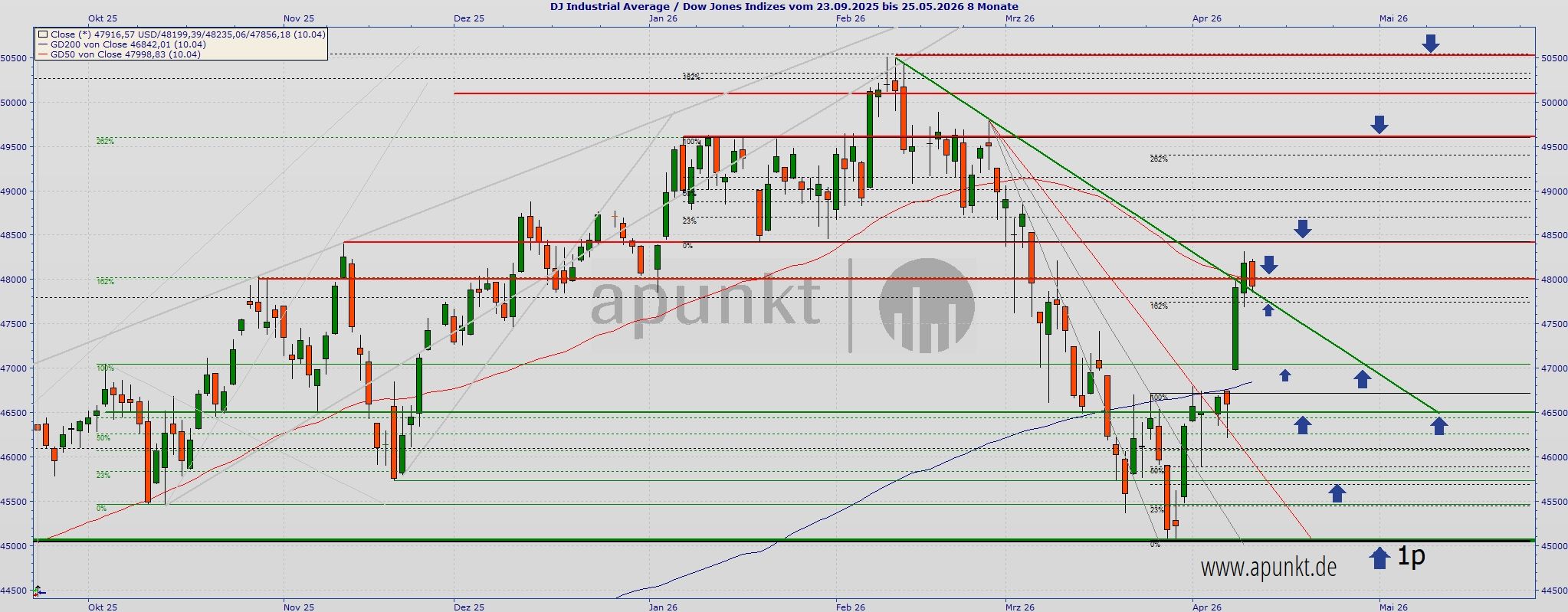 Der Wochenschluss lag aber immerhin (knapp) oberhalb der Abwärtstrendlinie, die ihren Ursprung am 11.02.26 hat. Das ist positiv, genauso wie der am Donnerstag gesehene Rücktest zum kurzfristigen Fibonacci-Ziel 47.750.
