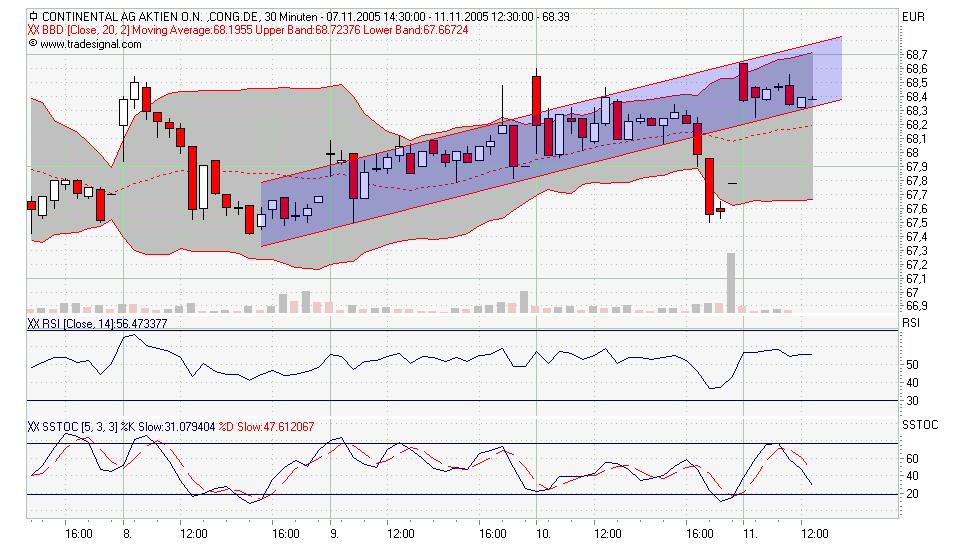 Conti pendelt im Bereich 67,50€ - 68,50€ hin und her, für mich schaut das nach "Luftholen" für den nächsten Upmove aus, mit Ziel neues Jahreshoch! Gap im Auge behalten. Werde evtl. morgen versuchen bei 67,50 € nachzukaufen (Optionsschein) RSI + Stocks befinden sich auf Rückzug, Bollinger ebenfalls sehr eng! M. M. nach sollte es bald up gehen ...