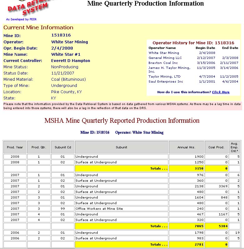 Der "Mine Report" wird mir zBsp. unter http://minemaps.ky.gov/MineReport.aspx?SFN=18429 zur Verfügung festellt. Ist jetzt nicht mehr aufbereitet!