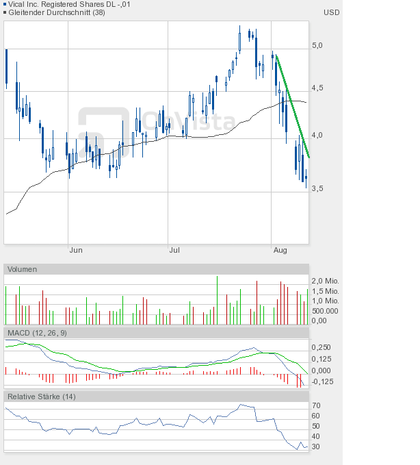 Vical hat charttechnisch noch den Vorteil, dass der Kurs noch deutlich oberhalb der 200-Tage-Linie notiert. Das können nicht mehr viele Werte behaupten.
