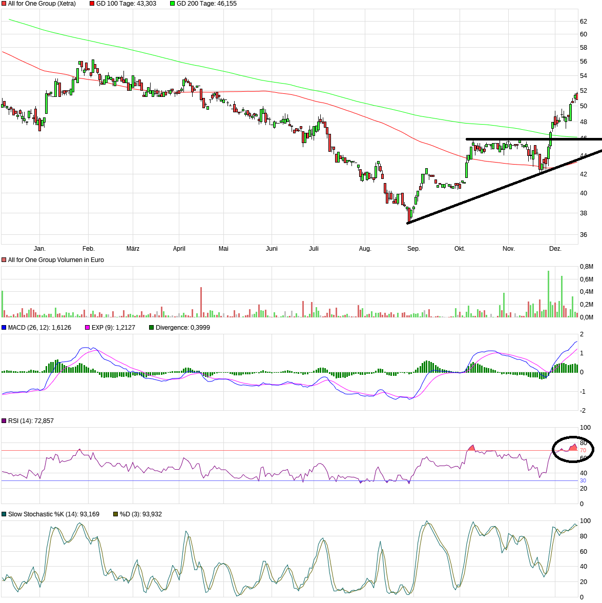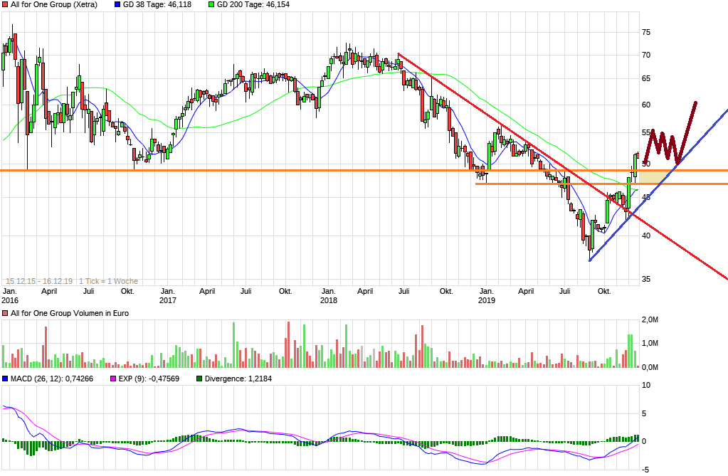 Es kann natürlich nochmal unter 50 gehen, aber technisch (fundamental sowieso) gibt's dafür eigentlich keinen Grund. Man hat alle wichtigen Widerstände genommen. Erst die 46 €, dann die 47 € und dann auch die 49 €. Es kommt zwar vor, dass so ein wichtiger Bereich nochmal von oben angetestet wird, aber muss wie gesagt nicht. Könnte auch gleich auf 56 € hochlaufen und dann geht man vielleicht ein paar Wochen seitwärts. Man ist aber jetzt klar im Aufwärtstrend. Es kann also auch deutlich stärker nach oben gehen. Man muss ja nicht immer die Trendlinie berühren. Wenn ich sehe, wie andere IT-Wert haussieren und viel teurer bewertet sind, hat A4O eh noch einiges aufzuholen.