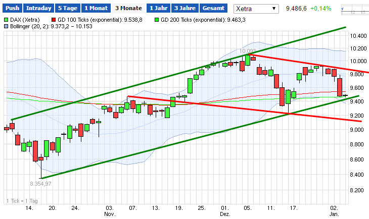 verläuft etwa die untere Begrenzung des aktuellen Aufwärtstrends. Bis dahin kann es m.E noch gut gehen, bevor es aufwärts gehen könnte. Das wäre auch nur ein leichtes Übertreten der ema200. Sofort bei Unterschreiten der 9440 auf short zu setzen, halte ich für zu riskant. Erst bei Tagesschlusskurs unter 9400 würde ich aktuell auf weiteren Down wetten.