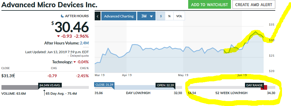 Vielleicht werden wir in den nächsten Tagen die 28 erreichen. Für wesentlich unter 28 sehe ich keinen Anlass. Am 7.7.19 gehen die neuen Prozessoren über die Verkaufstheke. Die Woche davor werden viele Leaks durch die Presse gehen bzgl. Leistung im Vergleich zu Intel+NVA. Das wird die Stimmung anheißen und alle Wissen das es nach dem 7.7.19 schnell wieder aufwärts gehen kann. Deshalb beginnt jetzt das warten auf den richtigen wieder Einstiegspunkt. Wer gerade an der Seitenlinie steht sollte Sprungbereit sein, denn der Zug wird mit Sicherheit ohne ihn abfahren.