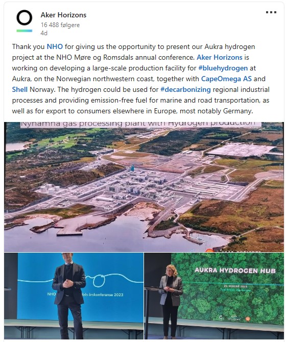 Vielen Dank an NHO, dass Sie uns die Möglichkeit gegeben haben, unser Aukra-Wasserstoffprojekt auf der Jahreskonferenz von NHO Møre og Romsdal vorzustellen. Aker Horizons arbeitet zusammen mit CapeOmega AS und Shell Norway an der Entwicklung einer groß angelegten Produktionsanlage für #blauen Wasserstoff in Aukra an der norwegischen Nordwestküste. Der Wasserstoff könnte zur #Dekarbonisierung regionaler Industrieprozesse und zur Bereitstellung von emissionsfreiem Kraftstoff für den See- und Straßenverkehr sowie für den Export an Verbraucher in anderen Teilen Europas, insbesondere Deutschland, verwendet werden.