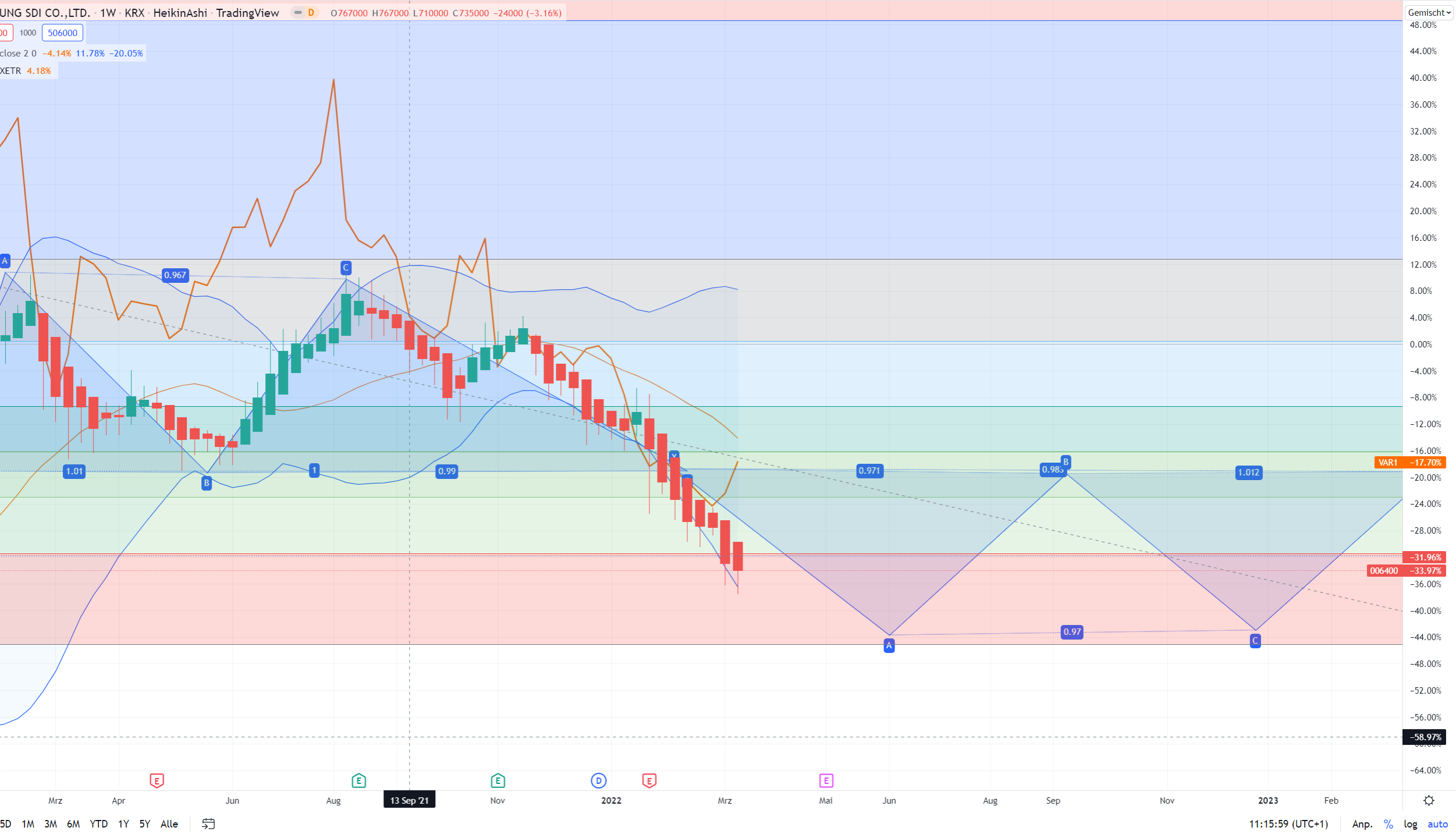 Hier der SDI-Chart, der sich ordentlich an die Kursprognose hält, Orange für das Varta-Verhältnis.