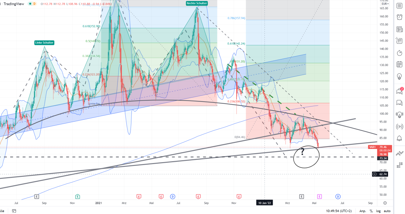 Ich interpretierte den Chart so, dass wir leider ein sehr großen FIT an Indikatoren haben, die kurzfristig bärisch sind und einen für die nächsten Tage Wochen kurzfristigen Downtrend beschreiben. Um den zu brechen, müsste der Kurs die 90iger Marke überspringen und ein paar Tage halten (also über den mBB, dann würden die Indikatoren in einigen Tagen ins neutrale drehen). Trendziel könnte das Verlaufstief bei 78 € sein, das würde zu dem RSI und den Indikatoren passen. Kommt das so (selbst ein Doch bis zur grünen Trendlinie wäre erst mal o.k. würde aber mehr Unklarheit schaffen) und wird das gehalten, idealerweise mit einem kräftigeren Rückprall, könnte man auf einen W Boden hoffen. Das wäre dann auch eine technisch ordentlich Bodenformation. Bestätigt wäre die erst mit einem Ausbruch über 96-100, aber zumindest wäre das eine Formation, die mich zu einer "Fuss in die Tür" Position anreizen könnte.