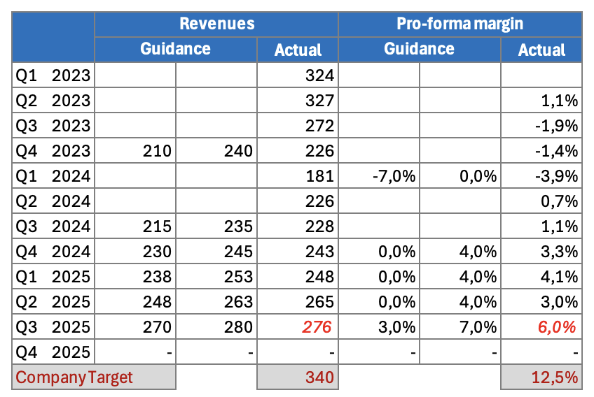 - Das letzte Mal, dass ADTN einen Umsatz zwischen 270 und 280 Mio erzielt hat (Q3-2023), resultierte in einer pro-forma Marge von -1,9%; dieses Mal soll das einhergehen mit +3-7%; hier sieht man mE die signifikanten Kosten, die rausgenommen wurden