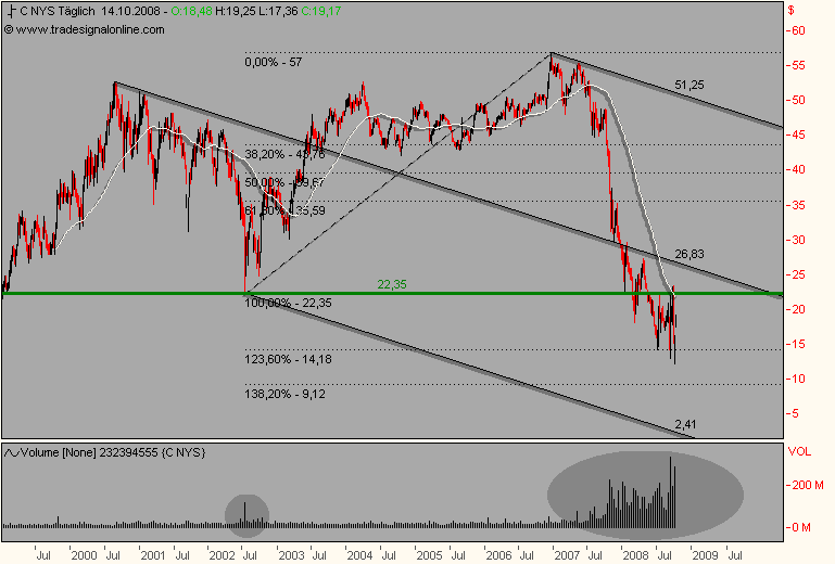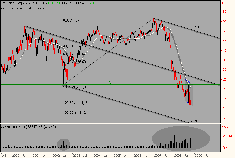 Nö, war in Citi investiert, bin gottseidank vor diesem Kursverfall raus. Die Citi hat schon mehrere Kapitalerhöhungen hinter sich, von den Camels, wie toni gut bemerkt hat, wird sie auch gestützt, aber im Moment geht es erst einmal down. Die Krise ist jetzt so richtig in Fahrt und da würde ich alles andere tun, als in Finanztitel zu investieren. Im Moment nutzen viele Unternehmen die Krise um ihre Leichen aus dem Keller höchst offiziell zu entsorgen, das war in der Vergangenheit auch nicht anders. Mich erinnert das Ganze an 2003 als die NEMAX-Blase platzte. Wir brauchen jetzt konstruktive Maßnahmen der Regierenden und um gottes Willen keinen Staatsbankrott, wie ich gestern schon gefürchtet hatte. 10.000.000.000.000 $ + x sind nicht gerade wenig, auch für die USA nicht. Aber ich sehe heute erstmals Hoffnung für das deutsche Finanzsystem. DAX und Tec-DAX halten erstmals gegen den Trend und schließen wahrscheinlich im Plus. Deutschland in Zukunft treibender Wirtschaftsmotor? Bitte nicht prügeln, nur so 'ne Idee.