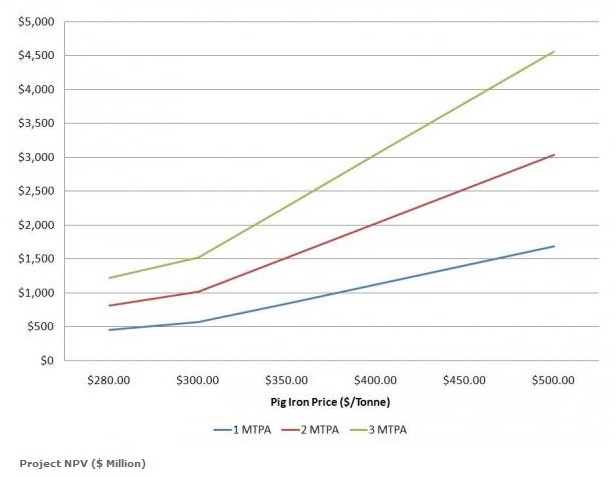 Die timeline wird Indo aufnehmen. Dafür habe ich die Daten der Scoping Studie nachgerechnet. Dabei ist mir eine Unstimmigkeit aufgefallen. Es ist eine Jahresmenge von 1Miot pig iron angegeben, bei einem Preis von @300US$ ergibt sich daraus ein NPV von 566MioUS$. Da ist schon der Wurm drin. Das NPV von 566MioUS$ kann nur aus der doppelten Menge pig iron entstehen.