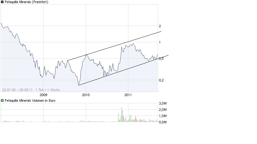 Bei Petaquilla braucht man jetzt nur eins.....Geduld. Ich bin erstmal froh das der starke Abwärtstrend gebrochen wurde. Weiterhin, dass sich die Fundamentals, hier ganz speziell die Explorationsaussichten (habe ich immer schon ein wenig bemängelt...nur meine Meinung) durch den Kauf von Iberian, erheblich verbessern werden/ verbessert haben.
