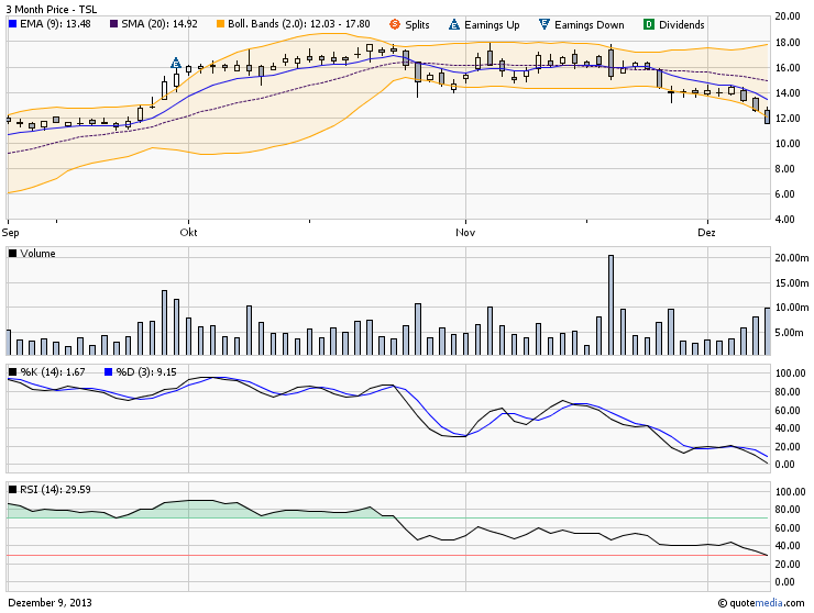 ....Trina (TSL) is up nearly two-fold. Trina shares may have reached a peak, having tested the $17.80 level numerous times between October and November. Shares closed recently at $12.57. ...Despite the decline, Trina is on a rebound. In the third quarter, revenue was $548.4 million on gross margins of 15.2%. Trina has 557.8 million in cash and cash equivalents. Looking beyond, Trina believes module revenue will grow to 15% of its total. After 2015, that portion could be 25%. Growing module sales should improve the steady growth potential. ...