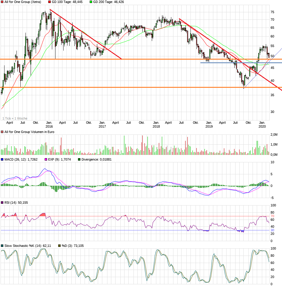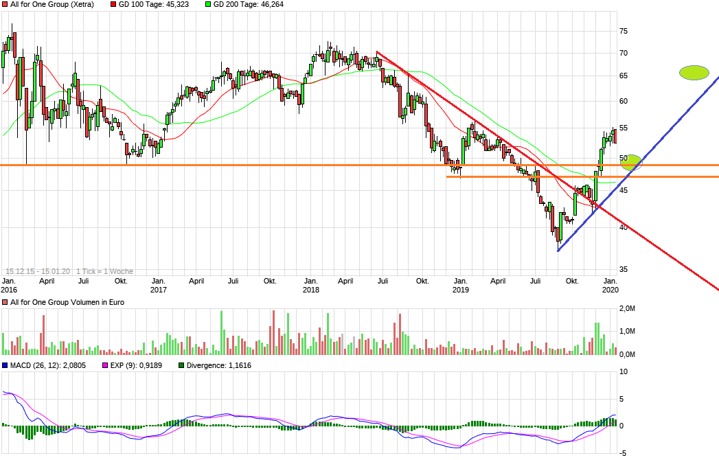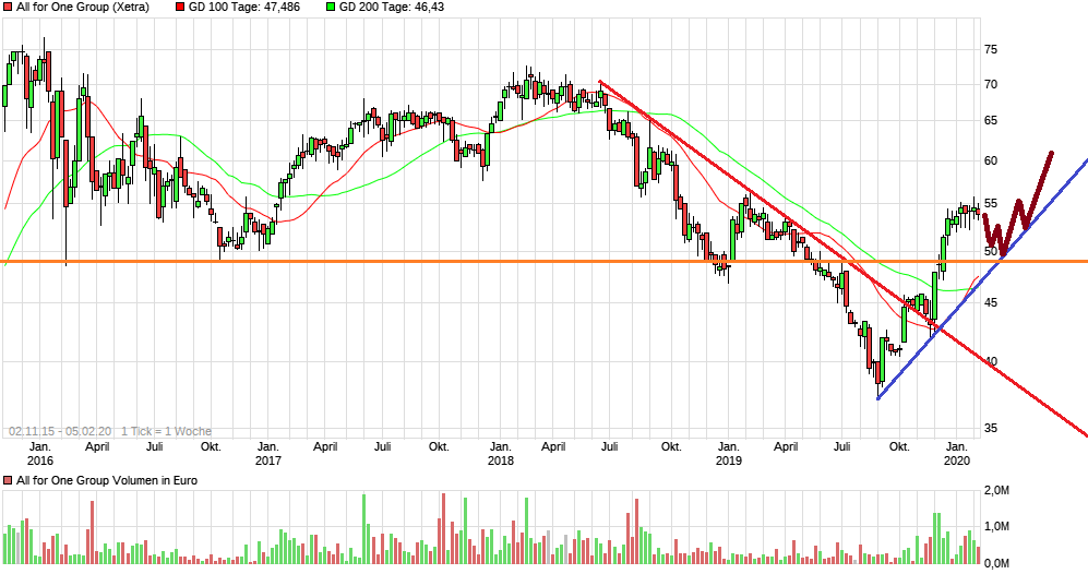 Ich bin mal gespannt. Theoretisch wäre weiterhin der Bereich 49 € optimal als Zwischentief, wo man auch noch aufsetzen könnte, um eine richtige Aufwärtstrendlinie zu generieren.