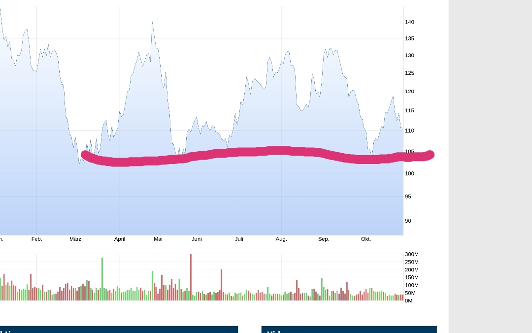 ... ich male bei meine Chartanalysen nicht mit so einem dicken Stift, aber das ändert nochts an der Kernaussage: Rund um 105 € liegt eine Unterstützungszone für den Kurs. Wenn diese nicht hält, fällt der Kurs auch bal unter 100,- €.