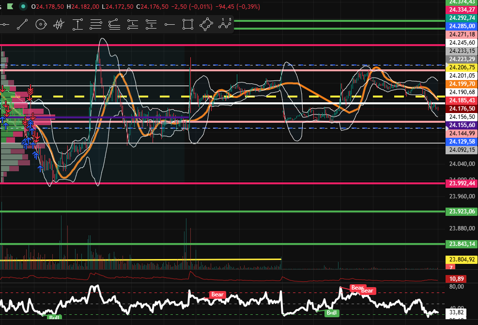 Der DAX ist im größeren Chartbild zwischen 23.480 und 24.800 neutral. Der DAX bleibt über 23.482 im kurzfristigen Aufwärtstrend. Der kurzfristige Aufwärtstrend bekommt erst wieder neuen Schwung, wenn es den Marktteilnehmern gelingt, das Börsenbarometer über das letzte tiefere Hoch bei 24.607 anzuheben. Der DAX hat eine Mini-Range zwischen 24.000 und 24.200 aufgebaut. Leicht BULLISCH: Über 24.200 löst sich die Mini-Range auf und es gibt Anstiegschancen bis 24.607/24.630. In die Range eingebettet hat DAX 24.115 eine stützende Funktion (SMA200 auf daily-Basis). Leicht BÄRISCH: Unter 24.000 löst sich die Mini-Range ebenfalls auf und es gibt Abwärtsrisiken bis 23.890 (EMA200 im Stundenkerzenchart, ROT). Das DAX-Level 23.890 stützt den DAX im Bedarfsfall, wegen der Wirkung des XETRA DAX EMA200 im Stundenkerzenchart (ROT).