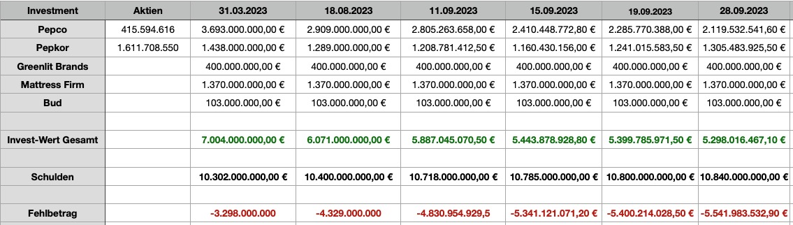 Jedenfalls sieht man an der Tabelle, dass mittlerweile der Asset/Schulden-Fehlbetrag größer ist als der Assetwert der Investments.