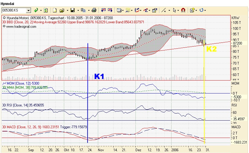 Et wird allet jut So, ich bin seit Freitag auch stolzer Mitbesitze­r von Hyundai. Nach der 2. weißen Kerze in Folge und der Rückkehr in den Trendverla­uf scheint die Konsolidie­rungsphase­ K2 vor dem Ende zu stehen. Man beachte den Stand der Indikatore­n bei K1 und K2! Hm, irgendwie ähnlich, nicht wahr?