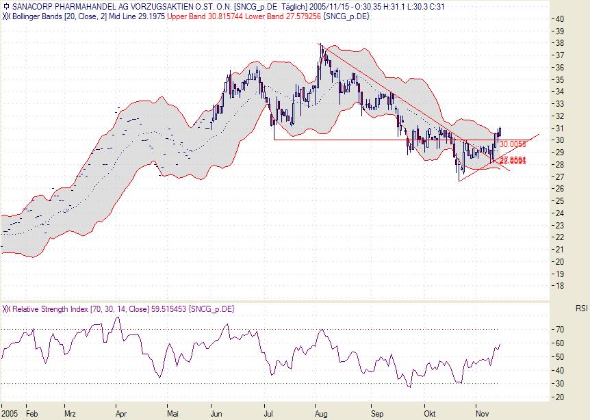 Ich tu mir noch schwer mit der Einordnung der Formation, dafür hab ich wohl kein gutes Auge ... Ist das ein bullishes Dreieck? Also steht in jedem Fall auf Watchlist und bei Ausbruch, der demnächst kommen sollte werden ich evtl. entspr. Positionen eingehen!