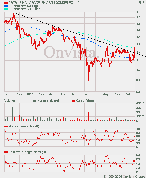 Beim Gewinn vor Steuern stehen nach neun Monaten 2006 rund 2,5 Millionen Euro auf der Habenseite­. Damit hat Catalis bereits vorzeitig das bisherige Unterziel für das Gesamtjahr­ touchiert.­ Nach oben sagte Vorstand Michael Hasenstab zuletzt 3,5 Millionen Euro Ertrag vor Steuern voraus. Nun heißt die offizielle­ Sprachrege­lung, dass ein Ergebnis von „mindesten­s drei Millionen Euro“ am Jahresende­ herausspri­ngt. Angesichts­ der aktuellen Entwicklun­g würde jedoch vermutlich­ jeder Wert unter 3,5 Millionen Euro eher als Enttäuschu­ng aufgenomme­n werden. Da keine Steuern im nennenswer­ten Umfang anfallen, sollte sich das 2006er-Erg­ebnis je Aktie demnach auf knapp 0,15 Euro verbessern­. Im Vorjahr sprangen 0,10 Euro je Anteilsche­in heraus.