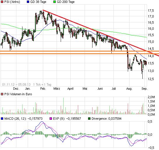 Zurück zu PSI. Hier liegt ein Downtrend vor, der sehr viele trend bestätigende Punkte hat. Deshalb ist er auch sehr aussagekräftig. Erst wenn er gebrochen wird, liegt ein entsprechendes mittelfristiges Kaufsignal vor.