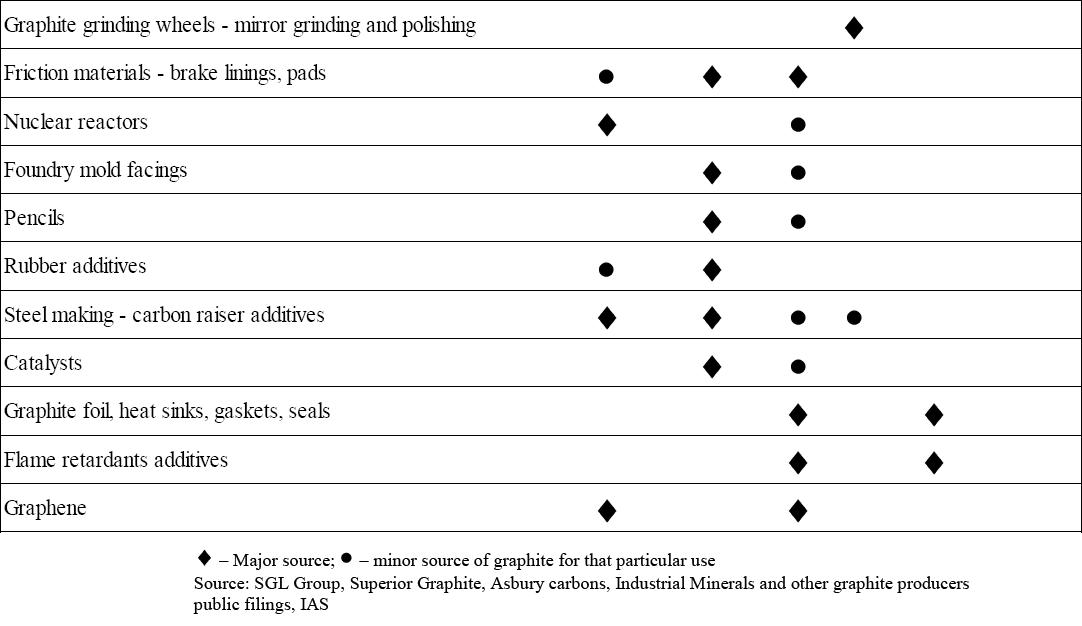 6. Diese Verwendungen sind: Feuerfest-Produkte und Schmelztiegel, Elektroden für Elektro-Stahl-Schmelzen, Reibbeläge (z.B. für Bremsen) und Kohlebürsten für Elektromotoren, Pulvermetallurgie, Kunststoffe, Glasfaserkabel sowie (jedoch nur bezüglich der kristallinen Natur-Graphite) Einsatz in Batterien und Brennstoffzellen, sowie Karbonfaserteile und Karbonfasern.