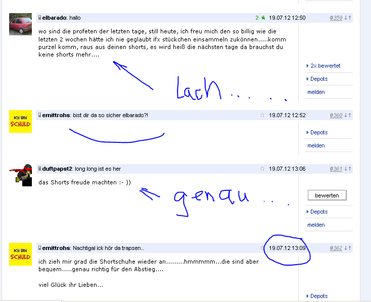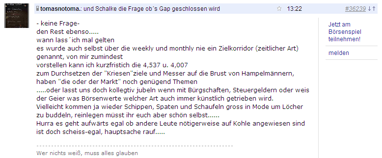 und es gab nur einen einzigen aus der Bullengruppe, der die Eier hatte zuzugeben, dass es anders kam als er dachte und das ich unter Umständen mit Zeitpunkt und Ansage richtig lag......ich nenn nicht die ID, er wird wissen wer gemeint ist.....vor solch einem Verhalten ziehe ich den Hut....