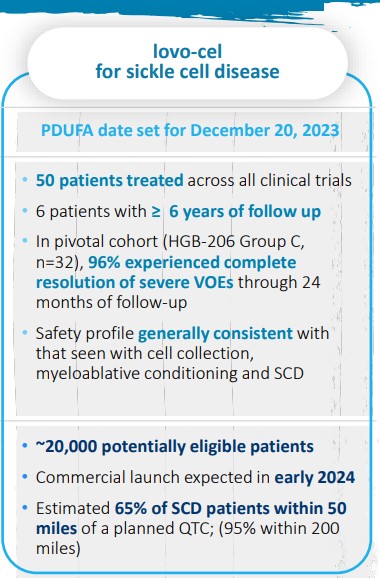 Zu den wichtigsten Katalysatoren gehören die rechtzeitige US-regulatorische Genehmigung seiner Gentherapie-Lovo-cel in Sichelzellen bis Dezember und die Einführung der drei Gentherapieprodukte von Co.