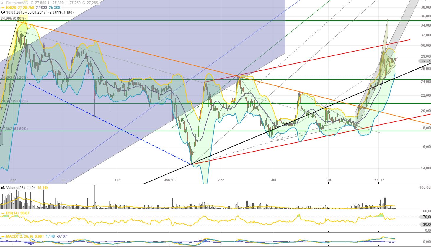 Wie man sehen kann, erwartet Formycon für 2017 fast eine Verdoppelung des Umsatzes und ein deutlich positives Ergebnis. Ich nehme an, dass dies zur Kapitalmarktkonferenz am 07.Dezember 2016 kommuniziert wurde und seit dem zu wieder steigenden Interesse an der Aktie geführt hat, nachdem der Kurs fast das ganze Jahr 2016 über im Dornröschenschlaf gelegen hat.