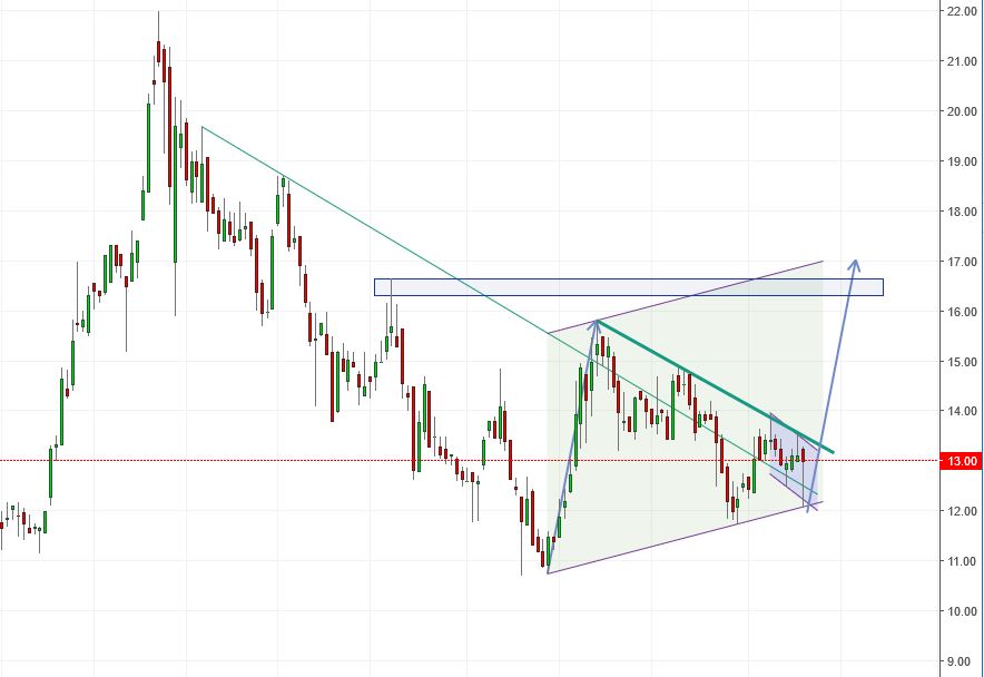 Dreieck welches immer enger wird. Siehe den Chart oben. Da könnte es dann ausbrechen. Dies kann ebenso durch einen Exit z . B. Passieren. Nach unten kann es aber auch gehen. Wen z. B. Die Gerichtsverhandlung schlecht ausgeht...