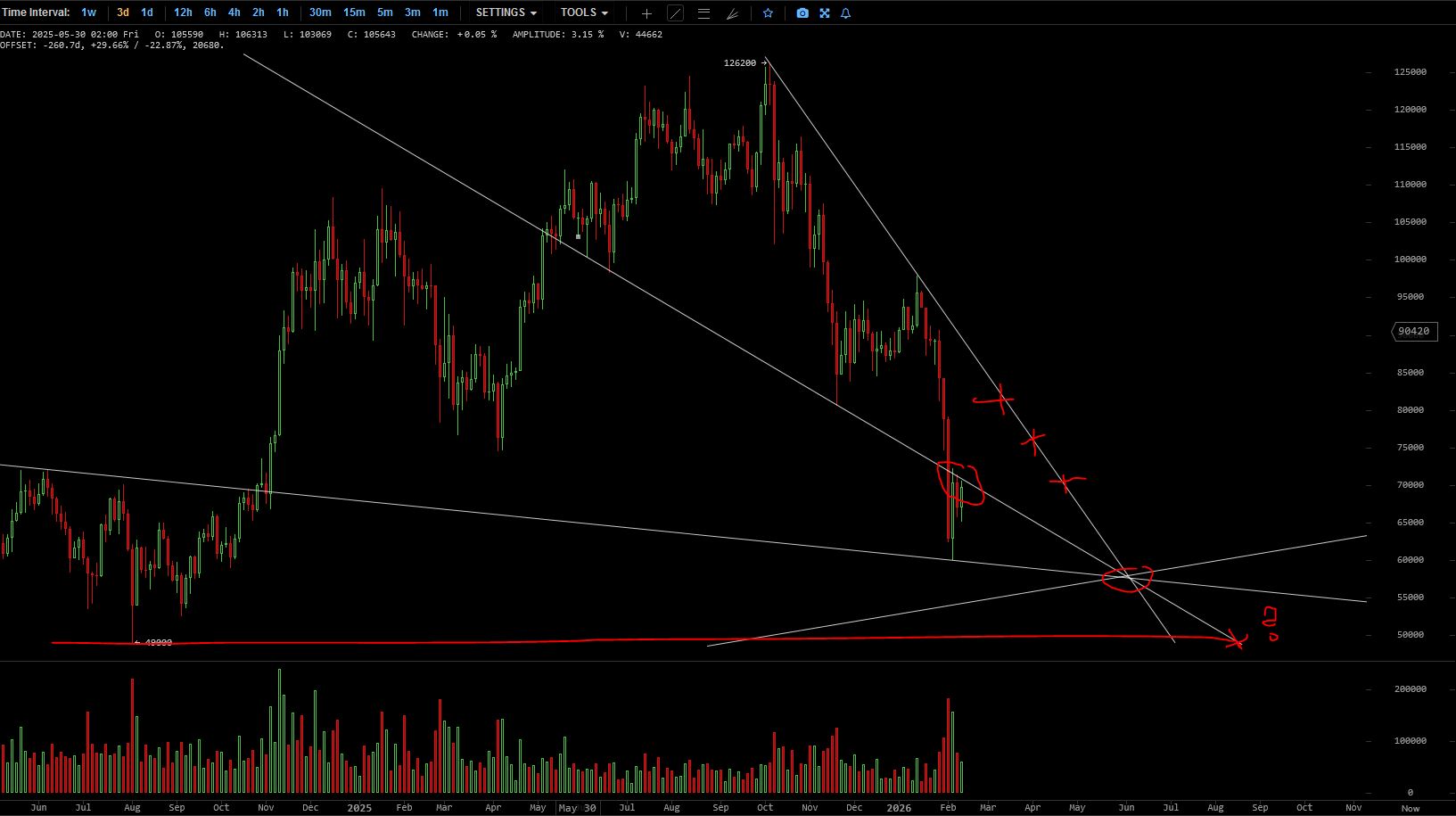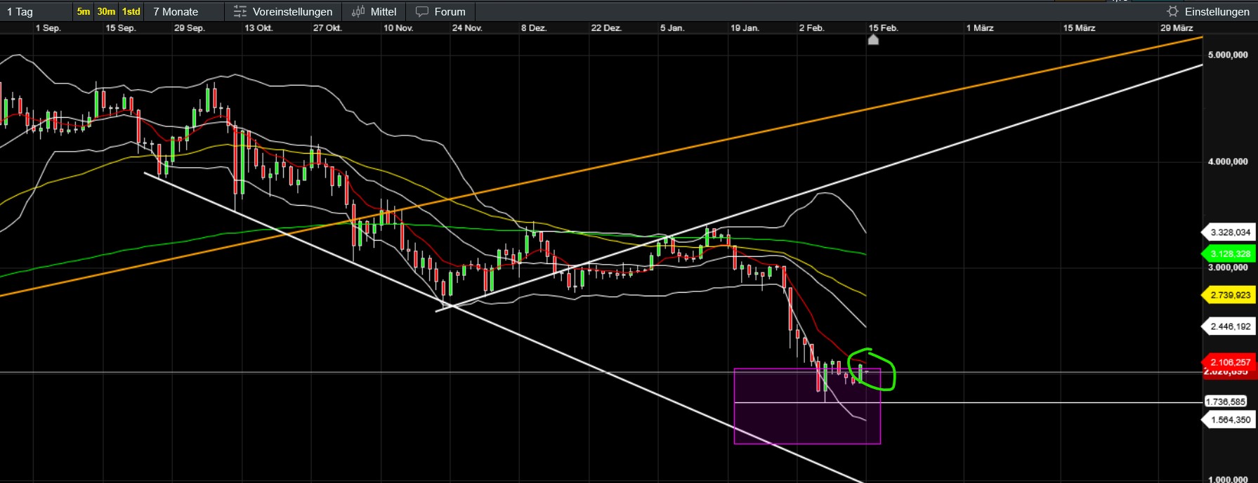 .... btc kämpft mit der linie, die vor kurzem unterboten wurde...geht es da drüber wird die obere linie getestet. ja nach stärke des impulses weiter oben oder weiter unten. danach fix in den 55k bereich... und wenn das nicht reicht...wird die linie mit der er gerade kämpft nochmal getestet später im jahr.