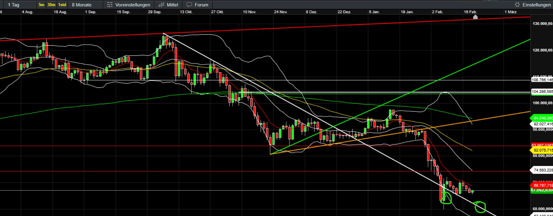 ...btc schafft es trotz überverkauftheit nicht in den keil zurückzufinden. schlimm.... sollte es nicht zeitnah gelingen landen wir gleich bei 56k... dort ist der aufwärtstrendlinie vom beginn des bullenmarktes bei etwa 15k-20k.