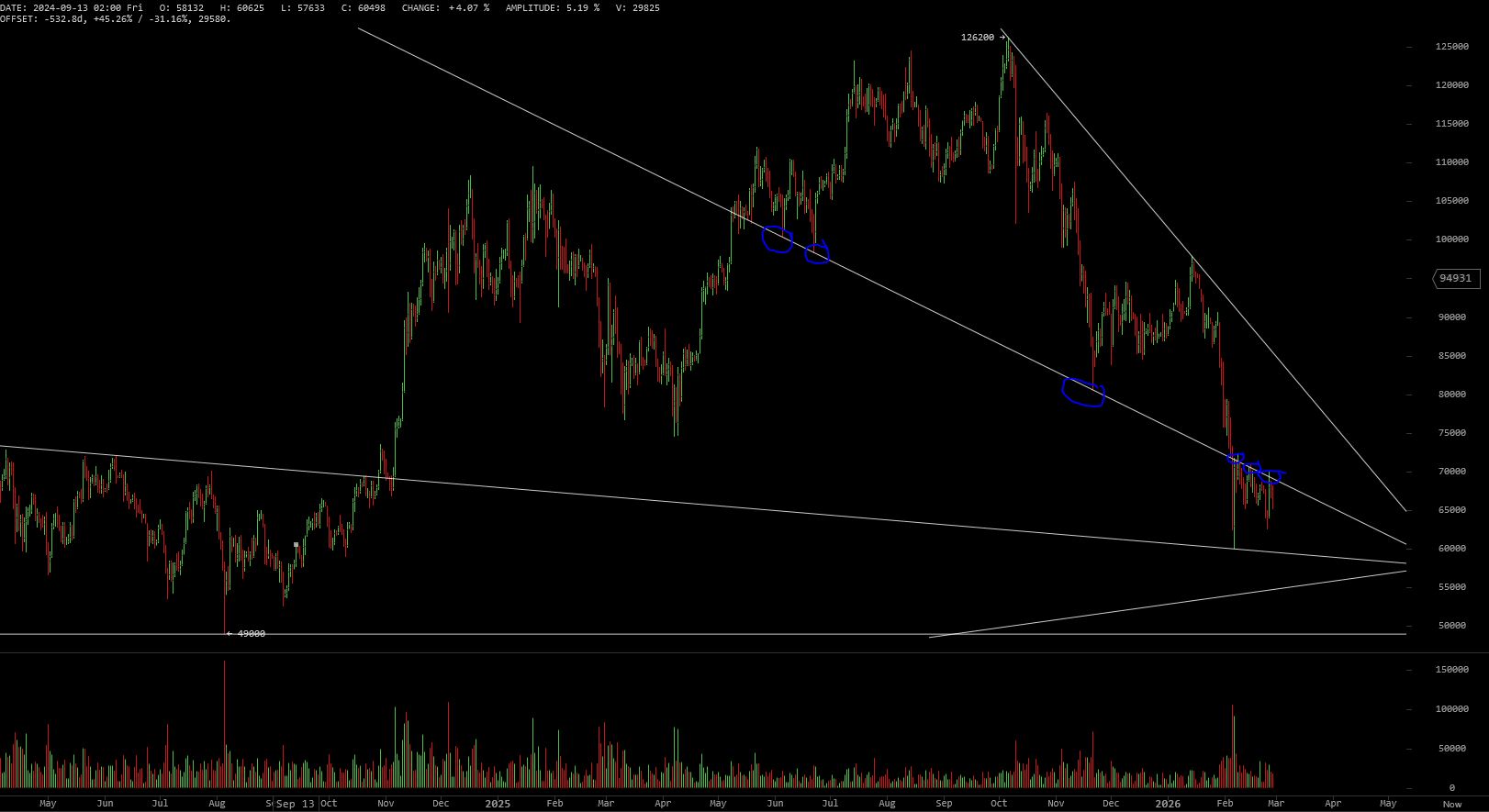 wie du richtig sagst der chart gab es her - aber bisher ist rein technisch noch nicht viel passiert - sie stehen im 240er direkt auf der flagge mit übertreibung - next step wenn das hier nicht hält wäre 60k