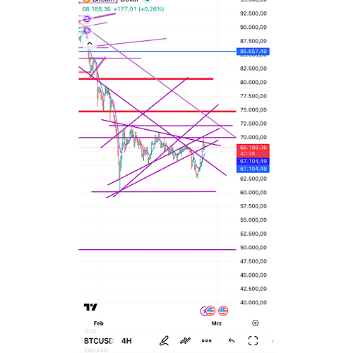 Wieder abgestürzt… daher kurz. Bei den Marken gibt mein Chart ähnliches her. Schade nur - falls es noch etwas höher geht - dass wohl wertlos, da noch lange keine Verkaufszonen. Allenfalls vielleicht gute Möglichkeit etwas Risiko neutral rauszunehmen durch Teilverkäufe. Dennoch stimmt der gestrige Tag positiv, da man gesehen hat, was die Altcoins für Bewegungen hinlegen können, wenn der BTC läuft. Bei mir Depot 11 Prozent im Plus. Polkadot 39%, SUI 17, Sol 17 etc…Das schürt Hoffnung für den nächsten Bullenmarkt auch wenn es sicher noch hart wird.