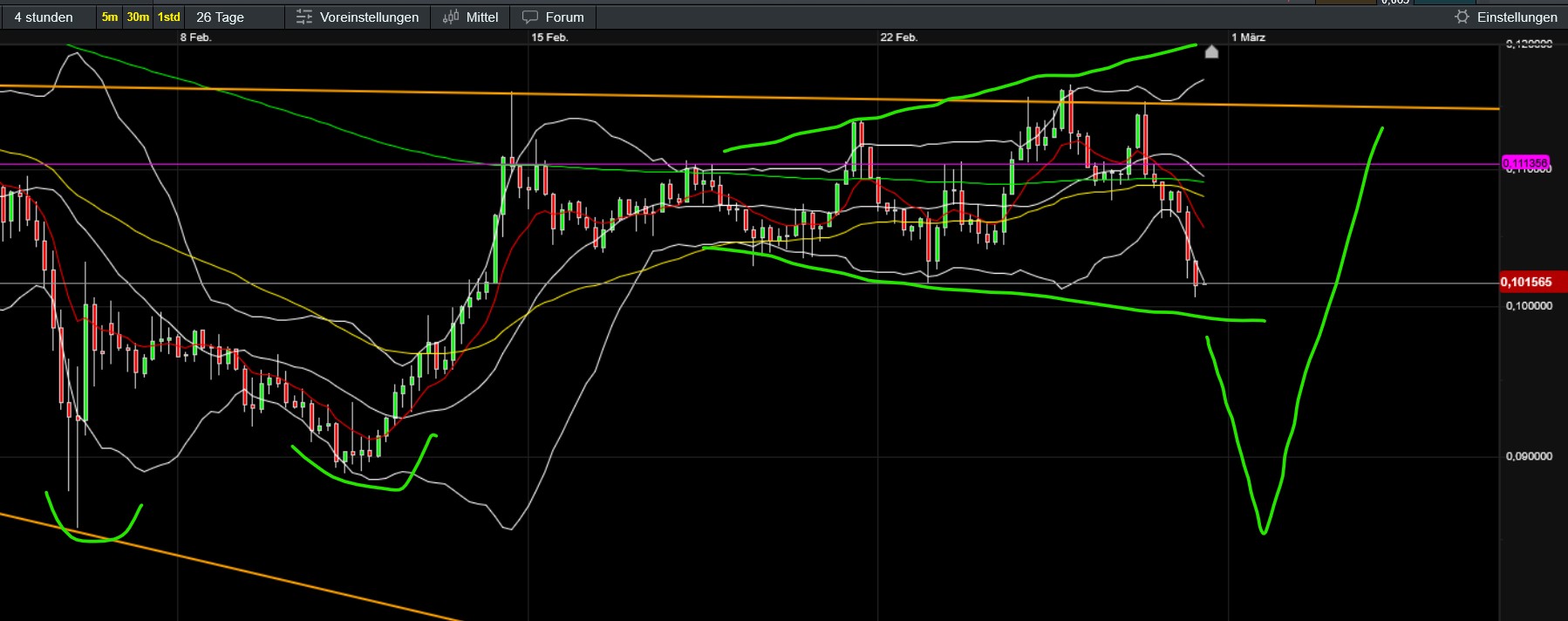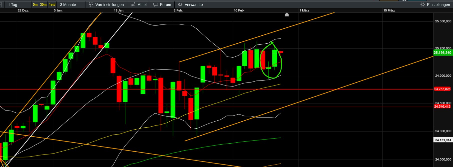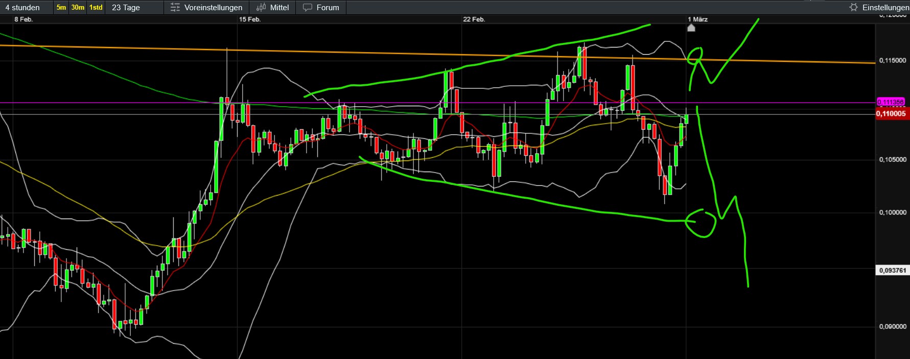 umkehrformatuion als boden hat funktioniert - wie immer gesmte breite als support - ema wurde schon getestet und hat gehalten - war wieder ein guter trade möglich - seitwärts über seitwärts werden indikatoren abgebaut - kein handlungsbedarf - dem volumen nach war der vermutete keil keiner
