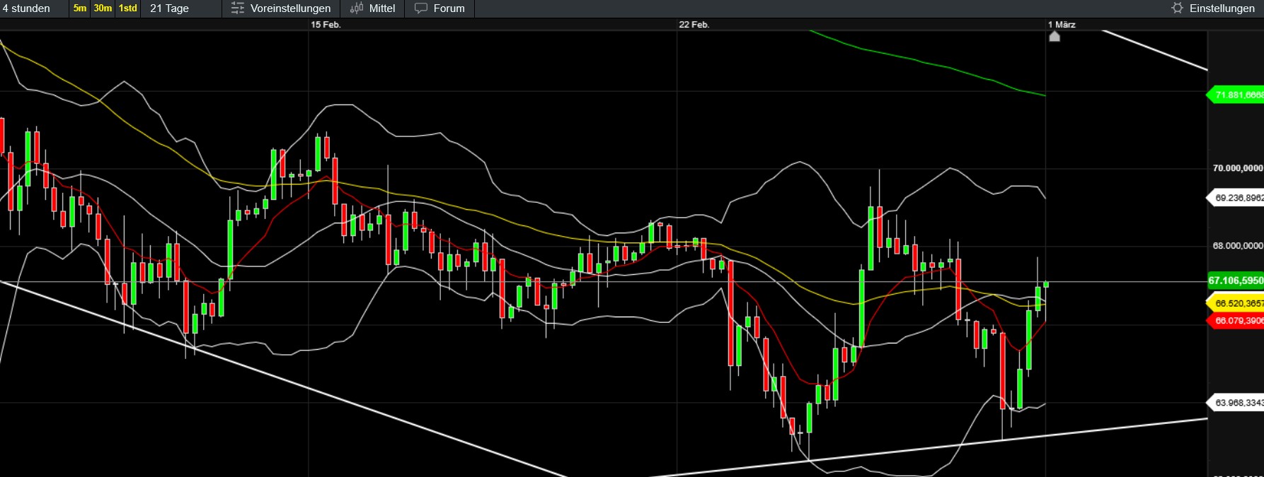 Doch noch kurz der Chart. Gestern exakt an die 70000 bzw. auch eine Trendlinie gelaufen. Mal schauen, ob aus dem aktuellen Geschwurbel eine Flagge wird. Dann wären wir im ev. im Bereich 75000. Alternativ könnte natürlich auch zuerst ein höheres Tief und dann der weitere Anstieg folgen. Oder aber - und ich würde das nicht ausschließen- das war es vorerst schon wieder oben. Das wäre wohl spätestens anzunehmen wenn wir wieder unter das lokale Tief bei 62500 fallen.