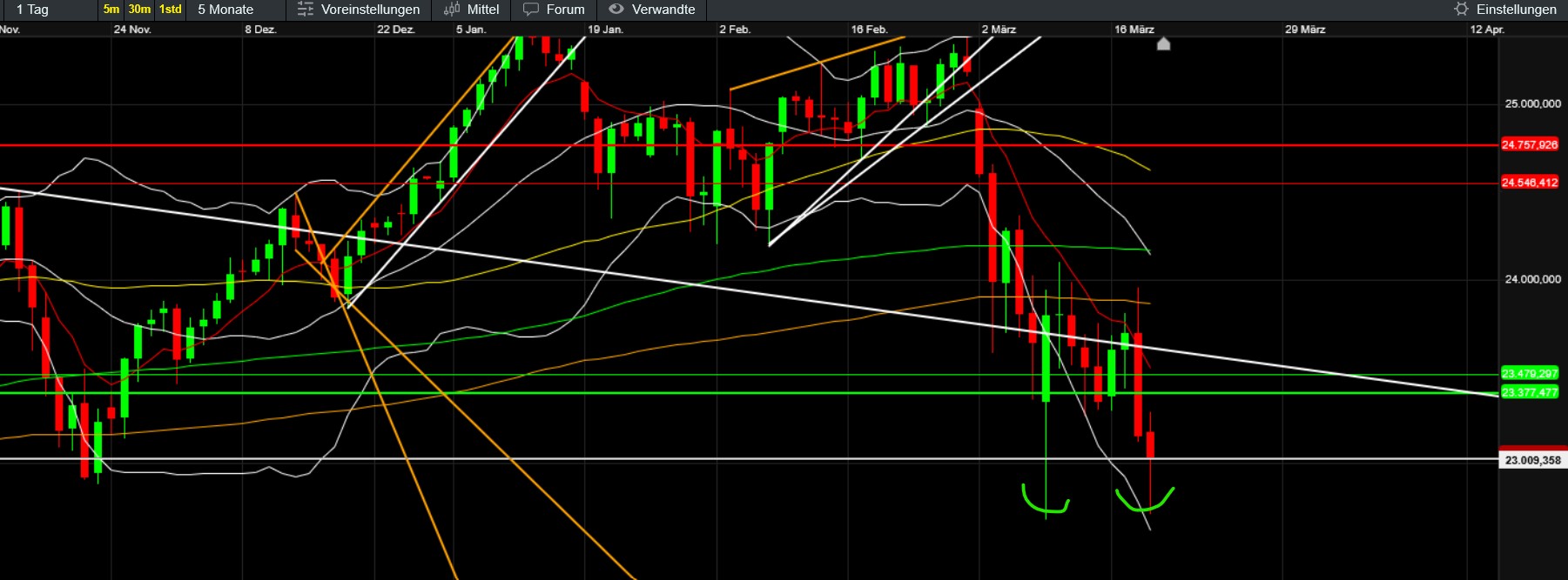 Neutrale Lesart: an 22.380 ist sowohl ein technischer Bounce möglich als auch eine Fortsetzung nach unten