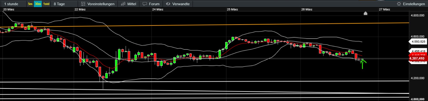 bin gerade in gold nochmal long gegangen - steht zwar auf der kippe - aber sl wäre hier wieder kurz mit ziel ema und mbb - solange der boden hält kann das noch was werden - hält der nicht haben wir eine umekhrform­ation down im daily