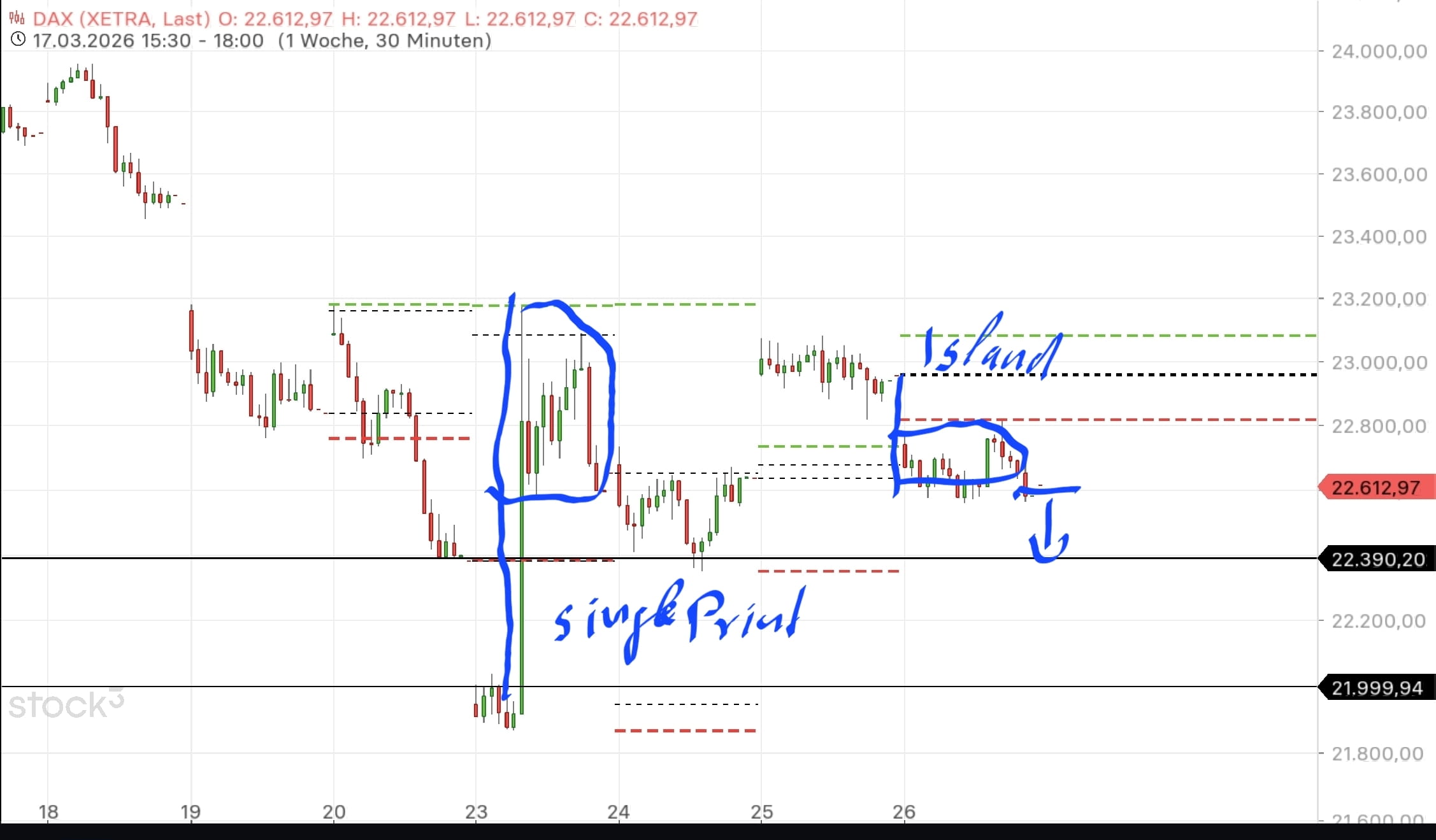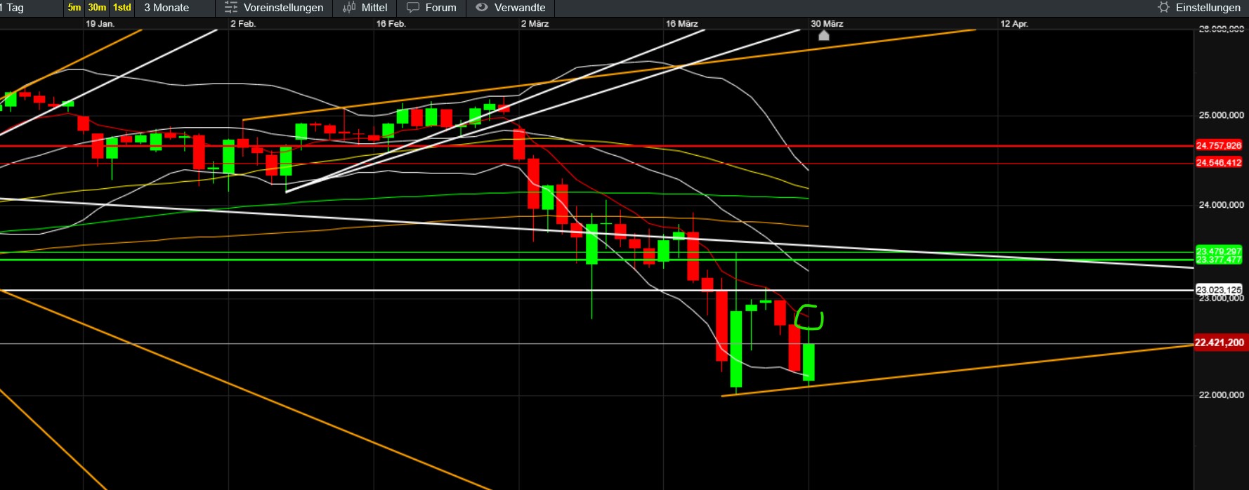 Nabend Einiges spricht dafür, dass wir die 22k unten im chart nochmals sehen werden. Allem voran der single print, der gefixt werden sollte. Ob sie das morgen schon schaffen oder erst am Montag bis 11.30 werden wir ja sehen.