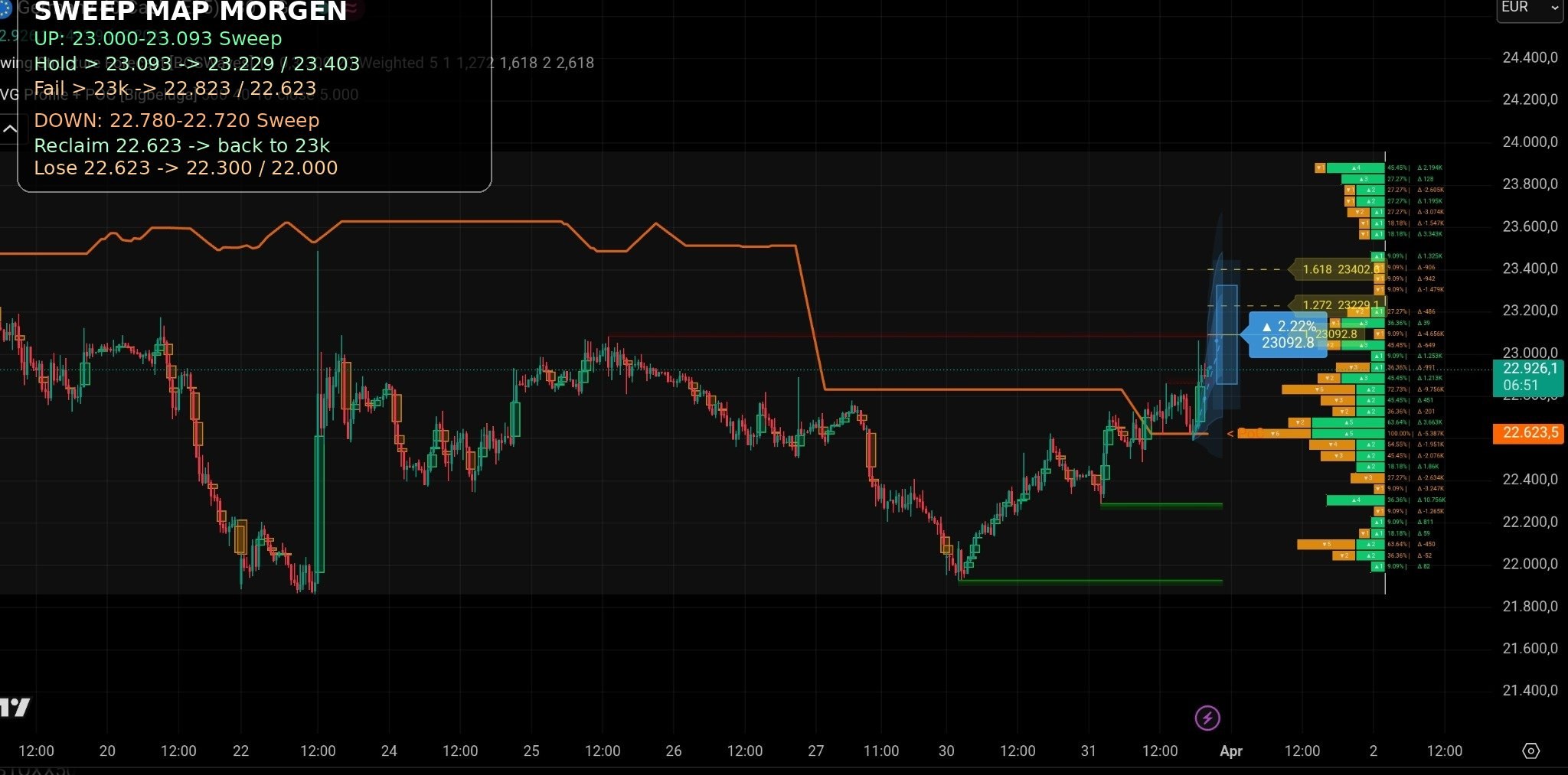 erst Sweep oben in 23.30–23.40, dann zeigt sich, ob Fortsetzung bis 23.58 kommt oder nur Distribution