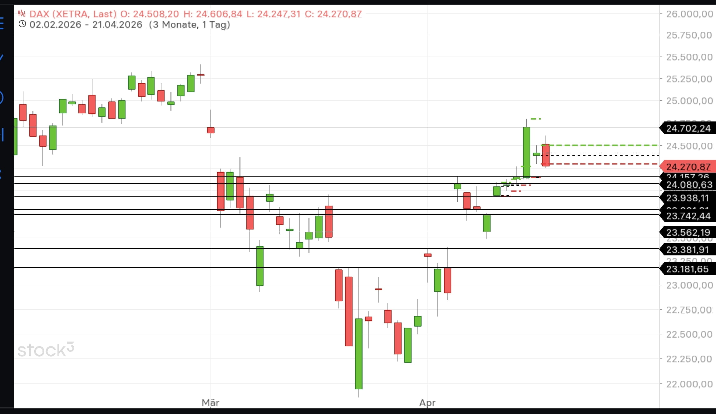 Der Markt hat oben den Ausbruch versemmelt, die Daily-Kerze sieht angeschlagen aus, und solange 24.045 nicht sauber zurückerobert wird, ist jeder kleine Bounce erstmal eher Kosmetik als Heilung.