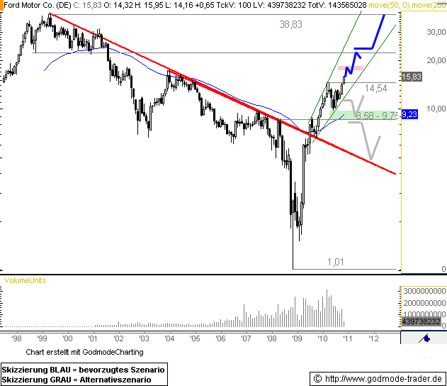 Der Abwärtstrendbruch Mitte 2009 gab dann das langfristige Kaufsignal. Selbst die Korrektur im frühen Sommer 2010 ließ die Aktie nicht weit zurückkommen, Käufer standen parat und drückten sie wieder nach oben. Die Folge ist nun ein Ausbruch auf ein neues Mehrjahreshoch, dynamisch zieht die Ford Aktie auf den höchsten Kursstand seit Mitte 2004 hinaus.