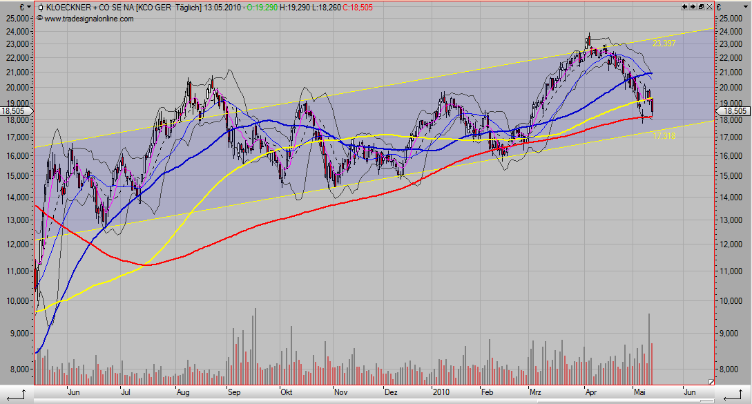 Ich bin bei Klöckner schon länger investiert und seit Ende 2008 sogar recht masiv. Seitdem gab es schon mehrfach Rückschläge von 3 bis 4€, doch der Aufwärtstrend blieb bestehen. Bisher habe ich die Schwankungen ausgesessen, da die Gewinne aus den Käufen vor 2009 steuerfrei sind. Ich gedenke das auch weiterhin durchzuhalten und sehe Klöckner, zumindest mit dem derzeitigen Management als Langfristanlage.