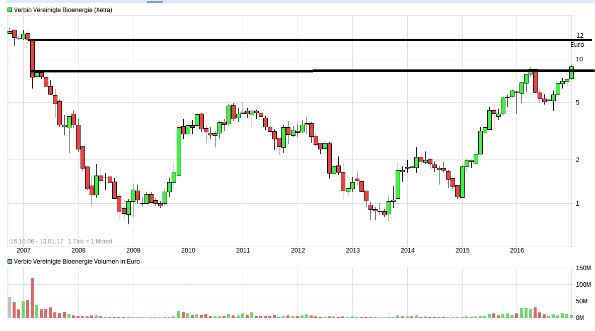 Unsere Depotaufnahme Verbio vor vier Wochen im Aktionärsbrief war ein Volltreffer. Die avisierte Prognoseerhöhung wurde gestern Realität. So erhöhte Europas führender Hersteller von Biokraftstoffen für das laufende Jahr 2016/17 seine EBITDA-Prognose von 55 auf 90 Mio. €. Statt einer Netto-Cash-Position in Höhe von 88 Mio. € zum Geschäftsjahresende, soll diese nun auf 120 Mio. € steigen. Bilanziell fährt man eine Eigenkapitalquote von 80 %. Der Autor geht jedoch noch weiter. Er rechnet mit einer weiteren Prognoseerhöhung und einer Dividendenerhöhung auf 40 bis 50 Cent je Aktie, was zweistellige Zielkurse erwarten lässt.