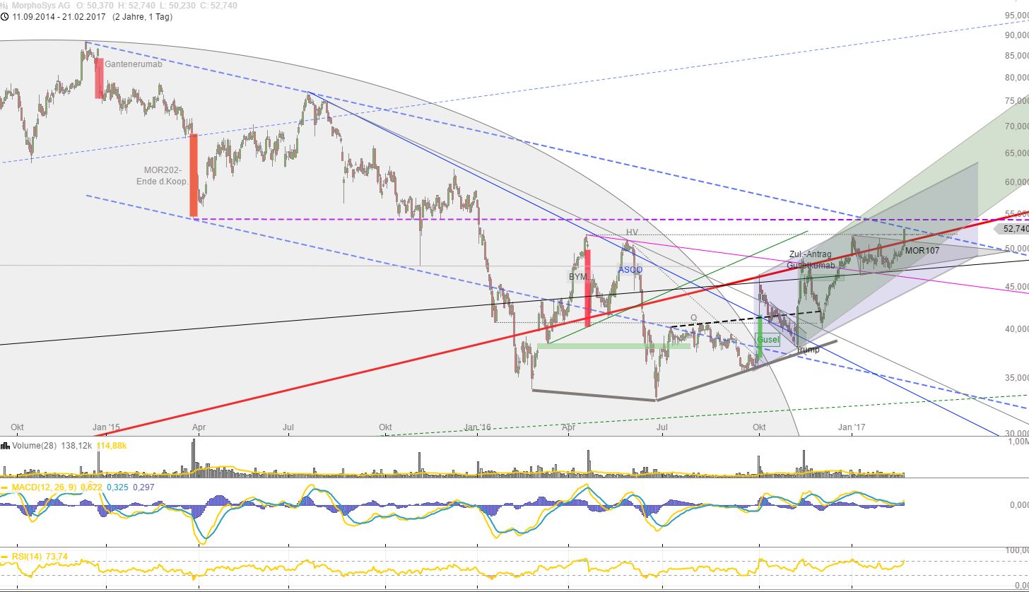 Oh, wie ist das geil! Morphosys hat im dritten Anlauf den hartnäckigen Widerstand bei € 52,- geknackt. Ein ganz, ganz großes Kaufsignal - jetzt schon langsam - Schritt für Schritt - auf 80 Euro (Schulter der Schulter-Kopf-Schulter-Formation)!