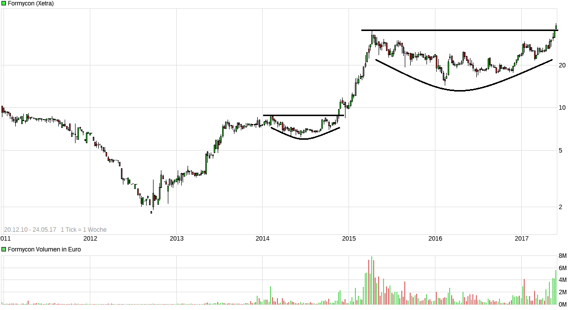 Das ist dann wohl endgültig der Ausbruch aus der (schönen!) Tassenformation in dieser Woche. Was das letzte Mal passiert ist, sieht man an der letzten längeren Konsolidierung in 2014... Mit einer nochmaligen Vervierfachung könnte ich leben ;-)