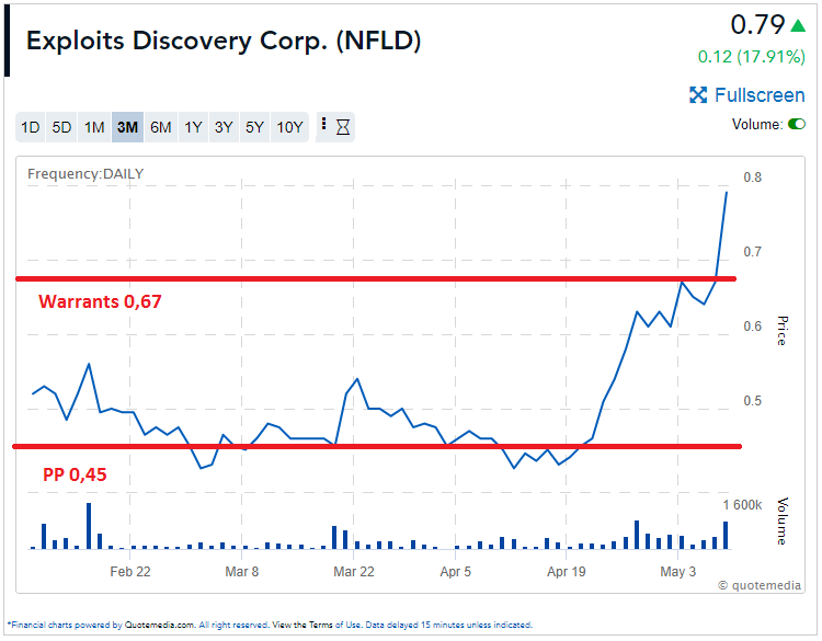 Exploits Discovery Corp. is pleased to announce a non-brokered private placement of $8,000,000 consisting of 13,333,333 units (the “Units”) at a price of $0.60 per Unit (the “Private Placement”). Each Unit consists of one common share (“Common Share”) and one common share purchase warrant (“Warrant”). Each whole Warrant entitles the holder to acquire one Common Share at an exercise price of $0.70 for a period of 24 months immediately following the closing date of the Private Placement.